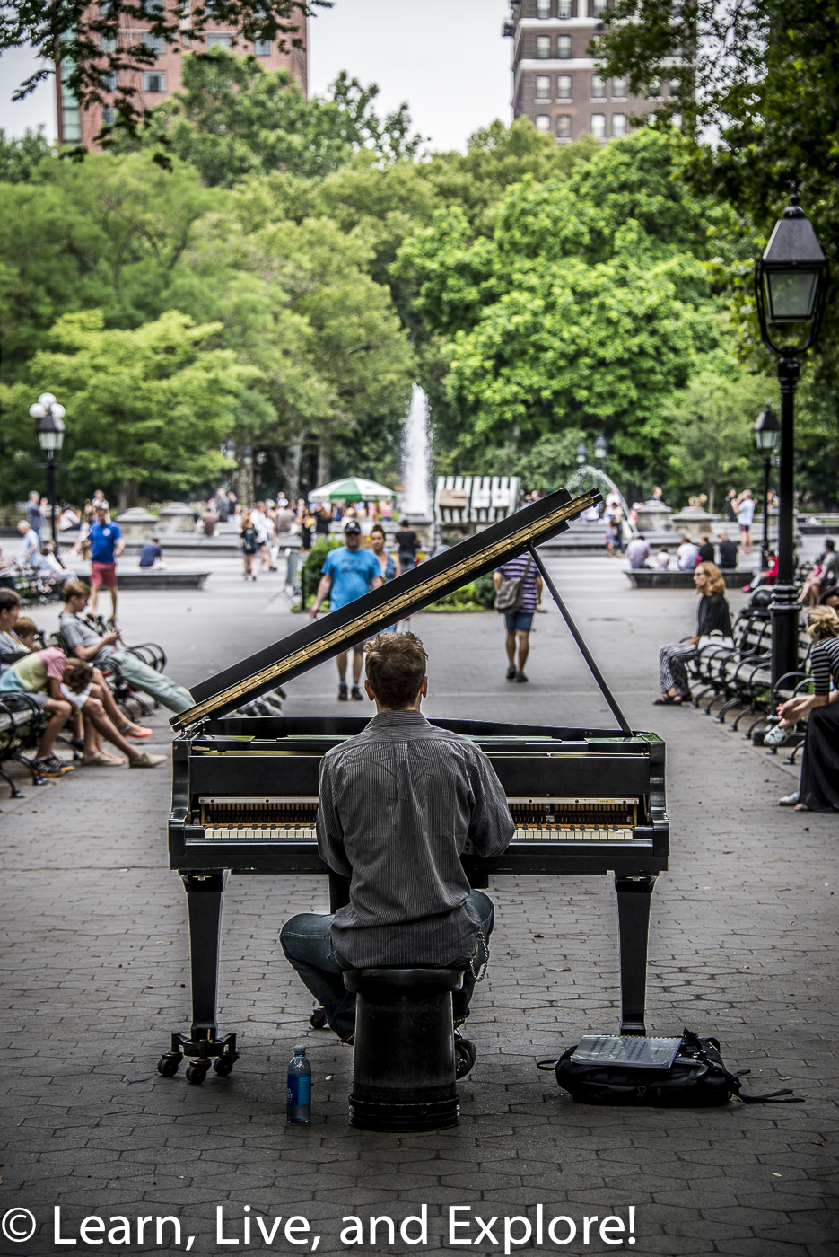 The original plan was a NYC microadventure of some old mews and alleys in Greenwich Village, or "The Village," that are reminders of the horse and carriage days. Many of these old buildings that remain were once rows of stables that belonged to nearby residences. There are a handful left in Manhattan, and a few more in Brooklyn, which I will have to see on another trip up to the city. So while I had planned for finding and documenting these small streets, what I got instead was a multitude of historical surprises and other beautiful treasures that tourists who concentrate their time in midtown (don't get me started on the gross people in animal suits in Times Square!) and Central Park never get to experience. One of these gifts was an NYU student who had wheeled out his piano to Washington Square Park to entertain park goers. He was playing Beethoven's "Moonlight Sonata."